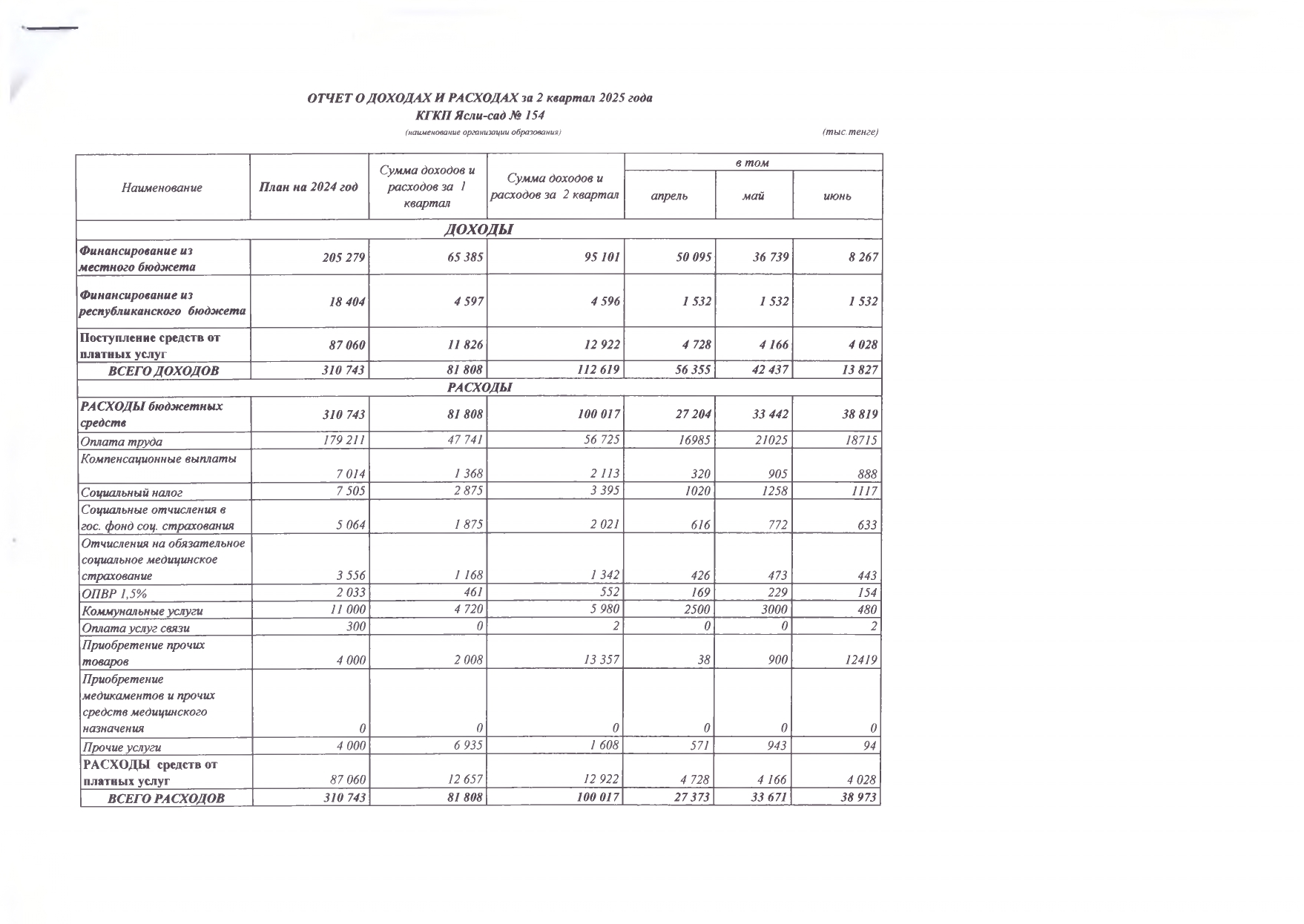 Отчет о доходах и расходах за 2 кв. 2025 года » ГККП "Ясли сад №154"